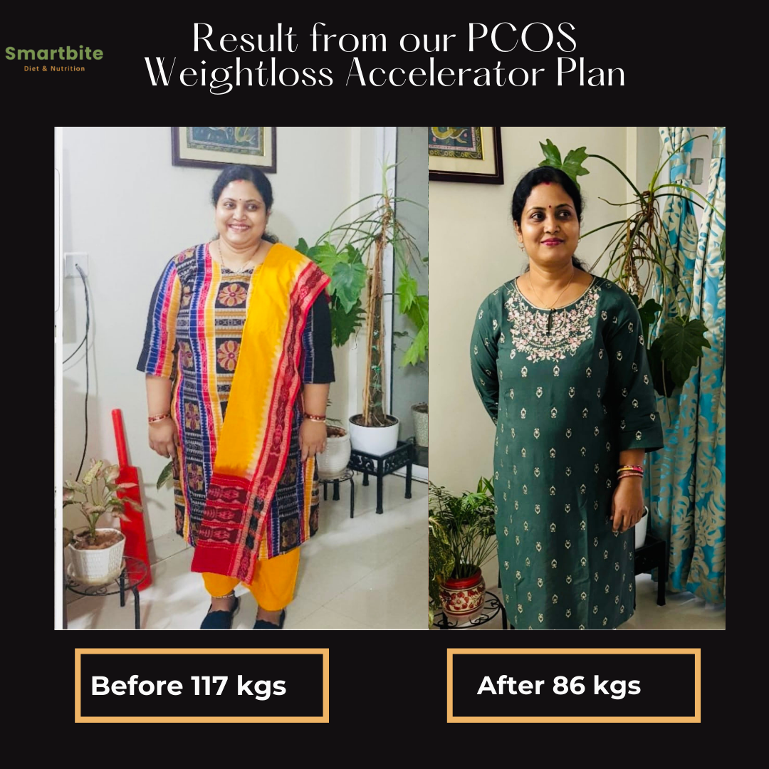 This transformation is of my client Pooja. When she joined me, she was struggling with PCOS along with multiple symptoms like acid reflux, bloating, irregular periods, hormonal imbalance, and joint pain. She had tried many things for weight reduction but nothing worked. Her goal was sustainable weight loss , not crash dieting. With the right nutrition and a balanced approach, she reduced her symptoms significantly and went from 86 kg to 76 kg within her target duration. Along with weight loss, she regained her stamina, improved joint health and now feels more energetic and confident in her body.